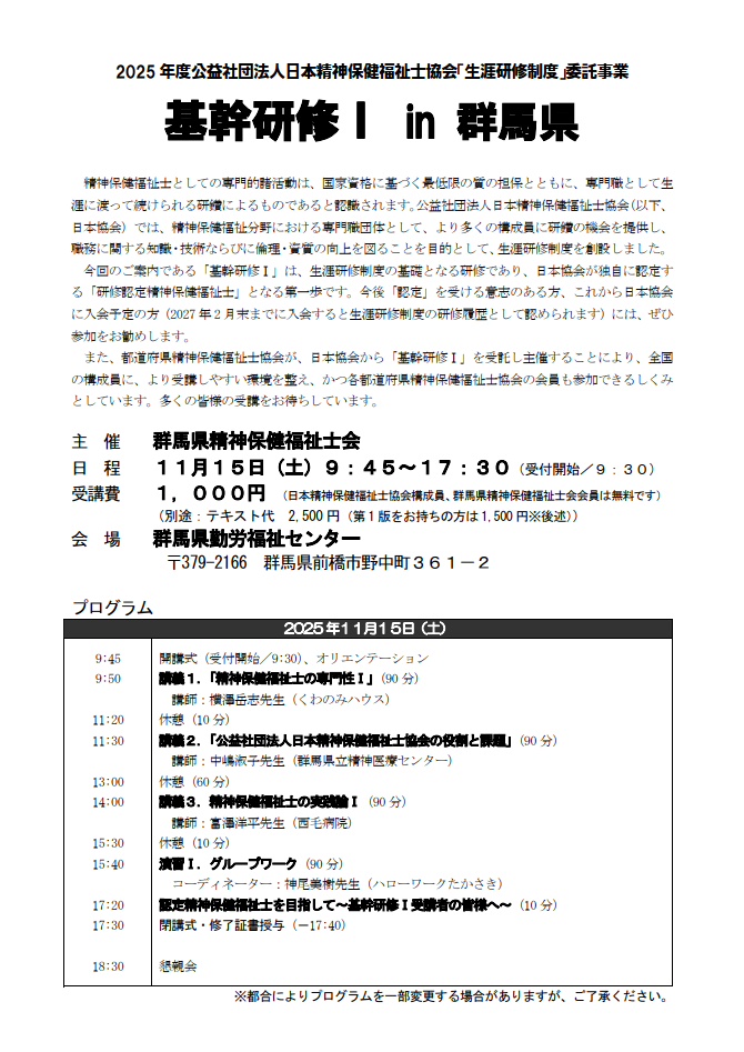 基幹研修Ⅰ in 群馬県 9月 24, 2025 最終更新日時 : 9月 24, 2025 admin 基幹研修1のお知らせです。基幹研修1は、日本精神保健福祉士協会(日本協会)から委託され当会で実施する研修会になります。日本協会の生涯研修制度の基礎となる研修で、日本協会が独自に認定する「認定精神保健福祉士」への第一歩となる研修です。会員の皆さまは無料で受講できます。詳細は、開催案内をご確認ください。申込み〆切は10月15日です。参加について、是非ご検討ください。