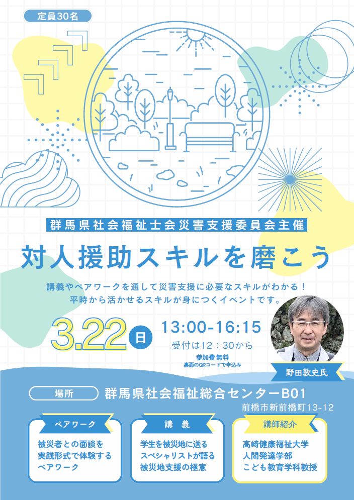 対人援助スキルを磨こう 2月 12, 2026 最終更新日時 : 2月 12, 2026 admin 群馬県社会福祉士会災害支援委員会主催研修 > 日 時:令和8年3月22日(日)13:00~>会 場:群馬県社会福祉総合センターB01>参加費:無料>定 員:30名(先着順) ↑画像クリックでチラシがダウンロードできます