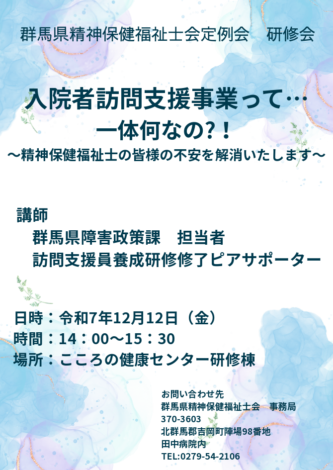 2025年度 群馬県精神保健福祉士会 第4回 定例会 11月 8, 2025 最終更新日時 : 11月 8, 2025 admin 2025年度 群馬県精神保健福祉士会 第4回 定例会を開催します。 >日時:2025年12月12日(金)14:00~ >場所:群馬県こころの健康センター研修棟
